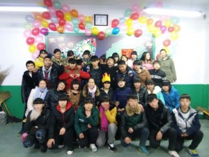 班主任和教官为班长刘燕飞同学制作生日王冠,全班同学写上祝福的话语,其乐融融。